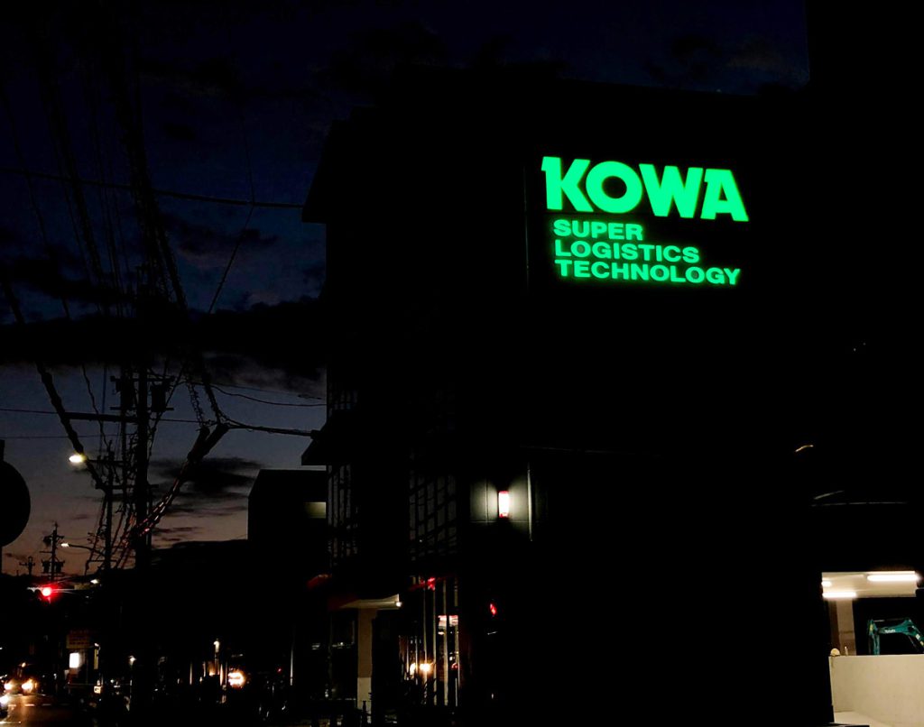 運送業の興和運輸株式会社様の本社新築時にトータルサイン計画、施工をいたしました。外壁に取り付けられたLEDサインが遠くからも昼夜目立つ看板になっています。正面発光のLEDサインは文字輪郭ラインに押縁と呼ばれるフチの有無で2タイプがありますが、KOWAの文字はフチ有りとし、その他は小さな文字のためフチ無しの仕様としています。小さな文字で輪郭ラインがあると昼間見た際にごつく見えてしまい元のロゴイメージが失われてしまいます。フチ無しの方がコストは割り増しになりますが、見栄え的に必要な際には採用されます。